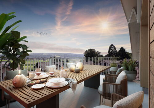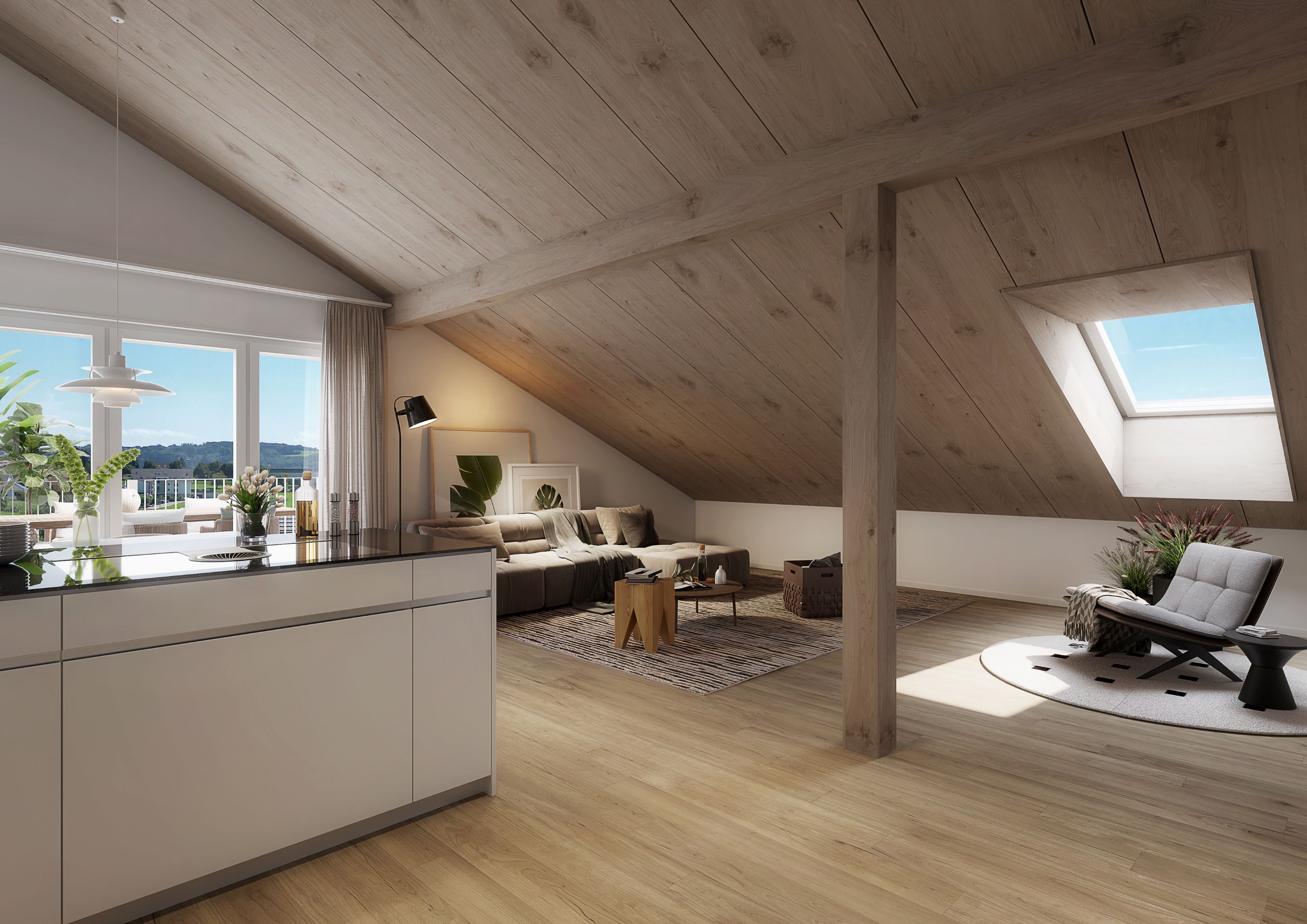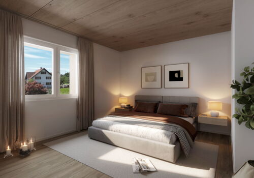 An der Verzweigung ins Underdorf-Quartier entstehen zwei charmante Wohnhäuser mit klassischem Satteldach, Dachlukarnen und einer hochwertigen Holzfassade, die sich harmonisch in die natürliche Hanglage einfügen. Die beiden Gebäude werden in moderner Holzelementbauweise errichtet und über einen gemeinsamen, einladenden und mit wildem Wein teilbegrünten Laubengang erschlossen. Die auf Strassenniveau gelegene Tiefgarage verbindet sich über einen Erschliessungsturm direkt mit dem Erdgeschoss, wo eine grosszügige Geländeterrasse die Häuser miteinander verbindet. Im Obergeschoss entsteht zusätzlich eine halbprivate Spiel- und Gemeinschaftsfläche mit direktem Zugang zur angrenzenden Landwirtschaftszone – ideal für Familien und gemeinschaftliches Wohnen. Durchdachte Grundrisse und eine intelligente Fensterplatzierung schaffen eine klare Abgrenzung zwischen privaten Rückzugsräumen und gemeinschaftlichen Bereichen. Die an der Südfassade angeordneten Terrassen sorgen für optimale Besonnung und bieten zugleich ausreichend Privatsphäre – ein Wohnkonzept, das Geborgenheit, Komfort und Gemeinschaft perfekt vereint.